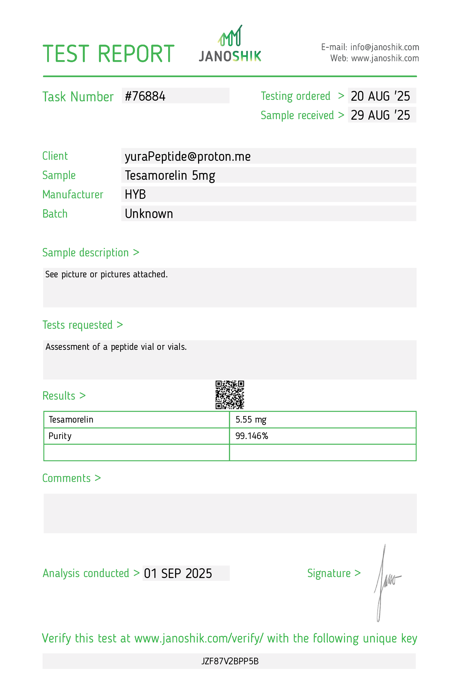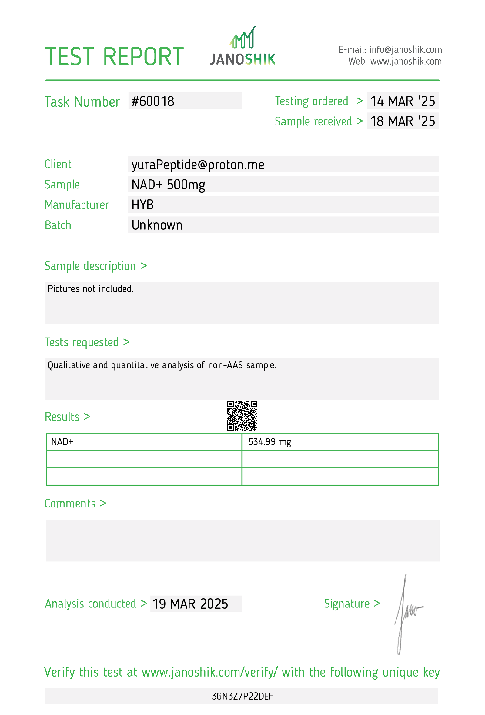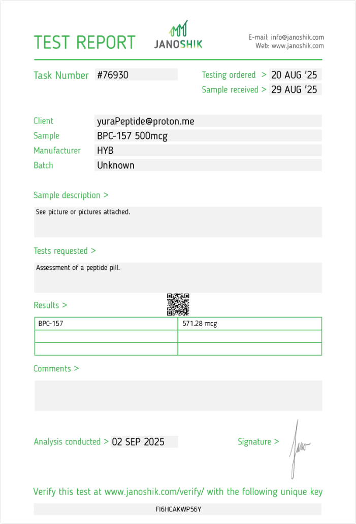 At HYB Peptides, we understand that serious researchers demand serious proof. That’s why every single peptide we sell is lab tested by Janoshik Analytical — the gold-standard independent laboratory trusted by the global research peptide community.