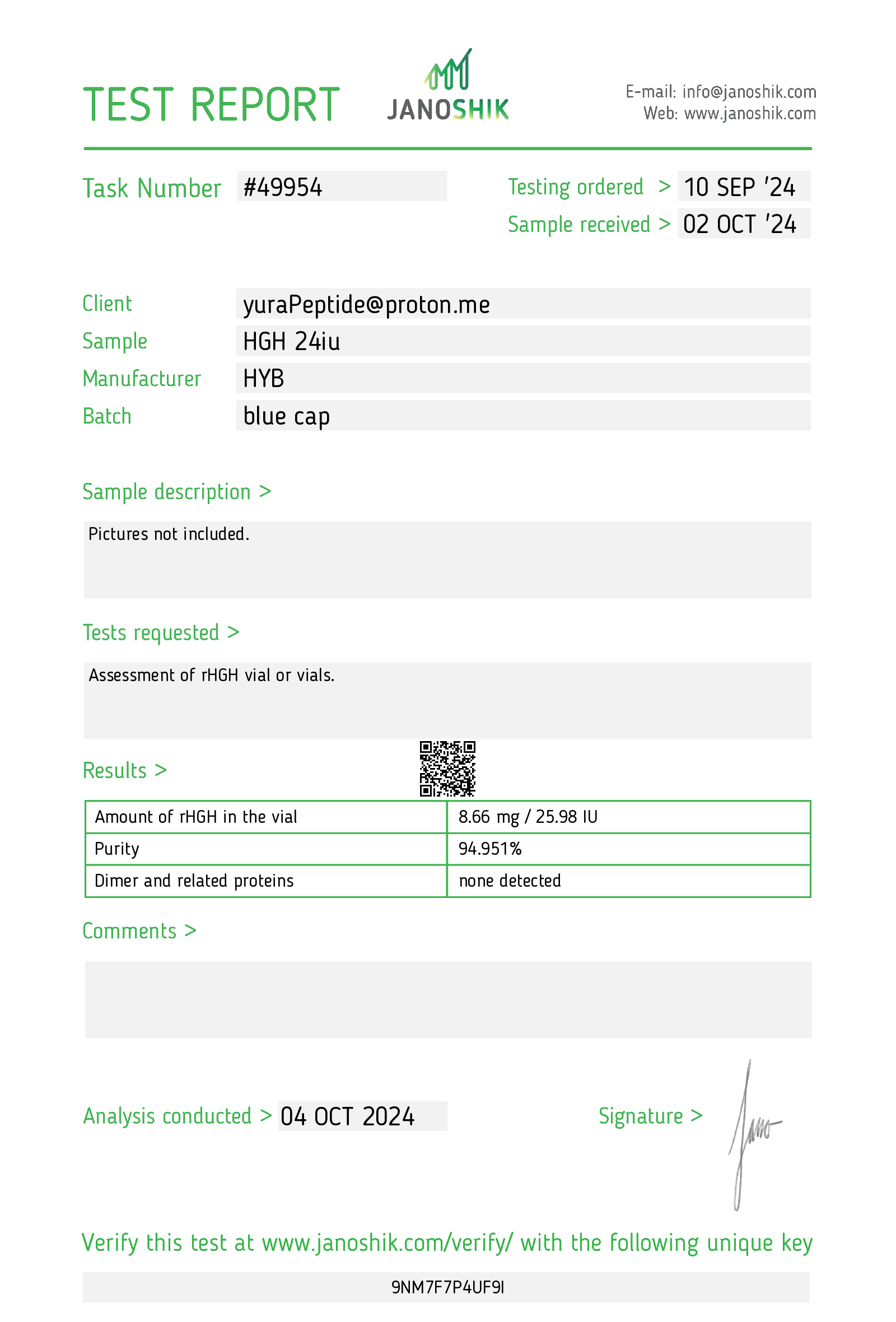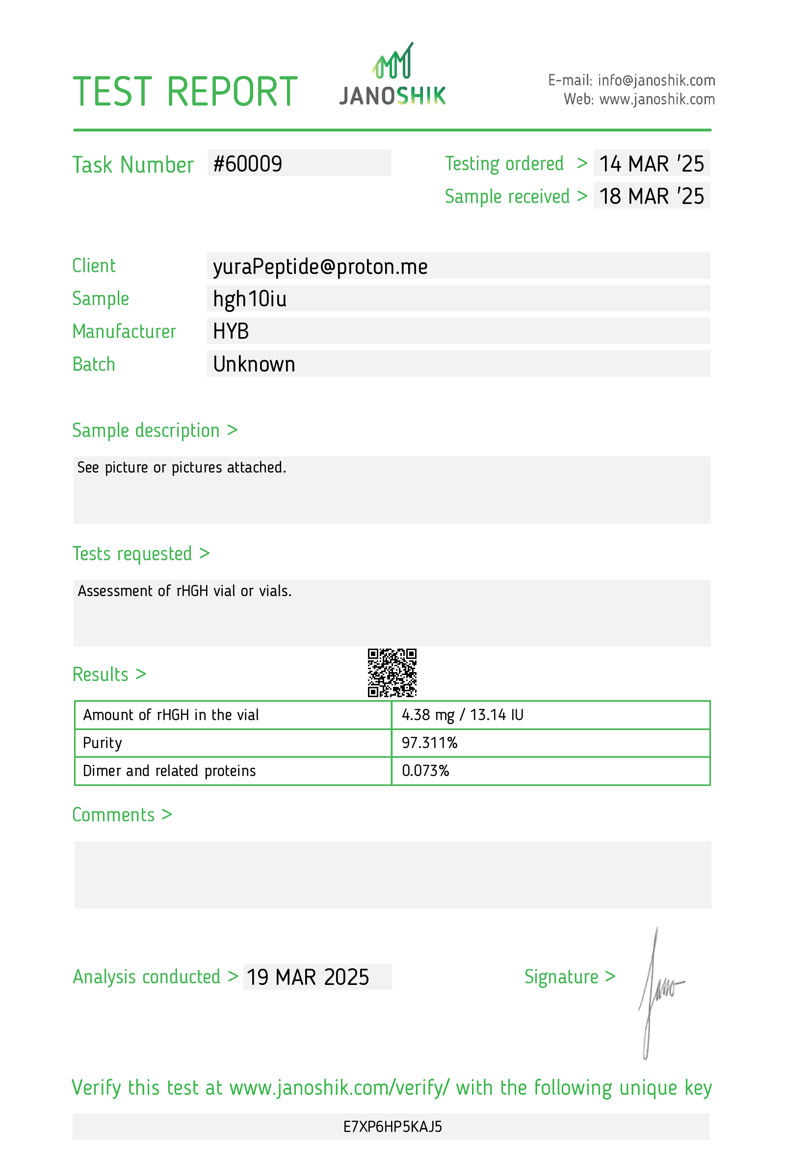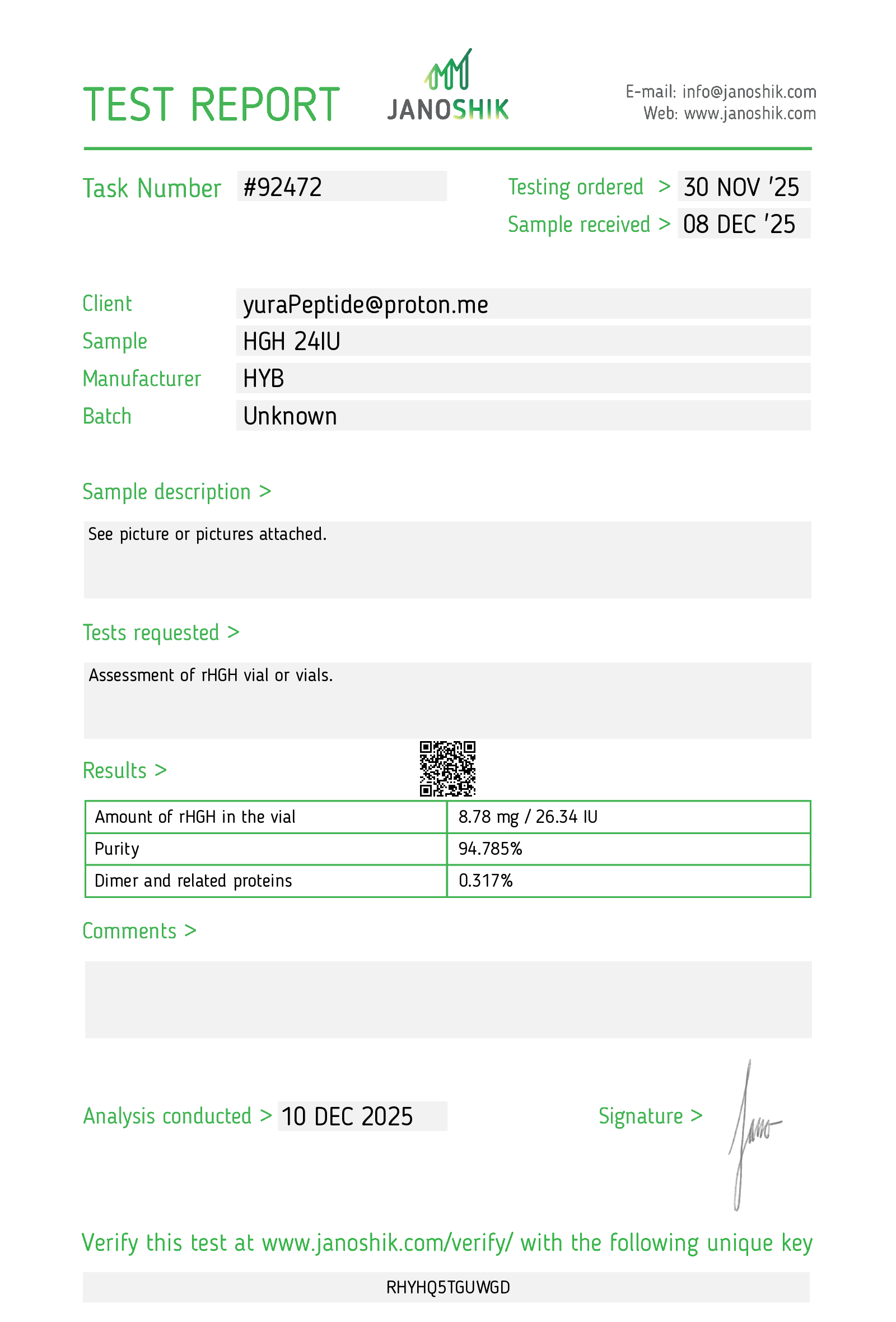 At HYB Peptides, we understand that serious researchers demand serious proof. That’s why every single peptide we sell is lab tested by Janoshik Analytical — the gold-standard independent laboratory trusted by the global research peptide community.