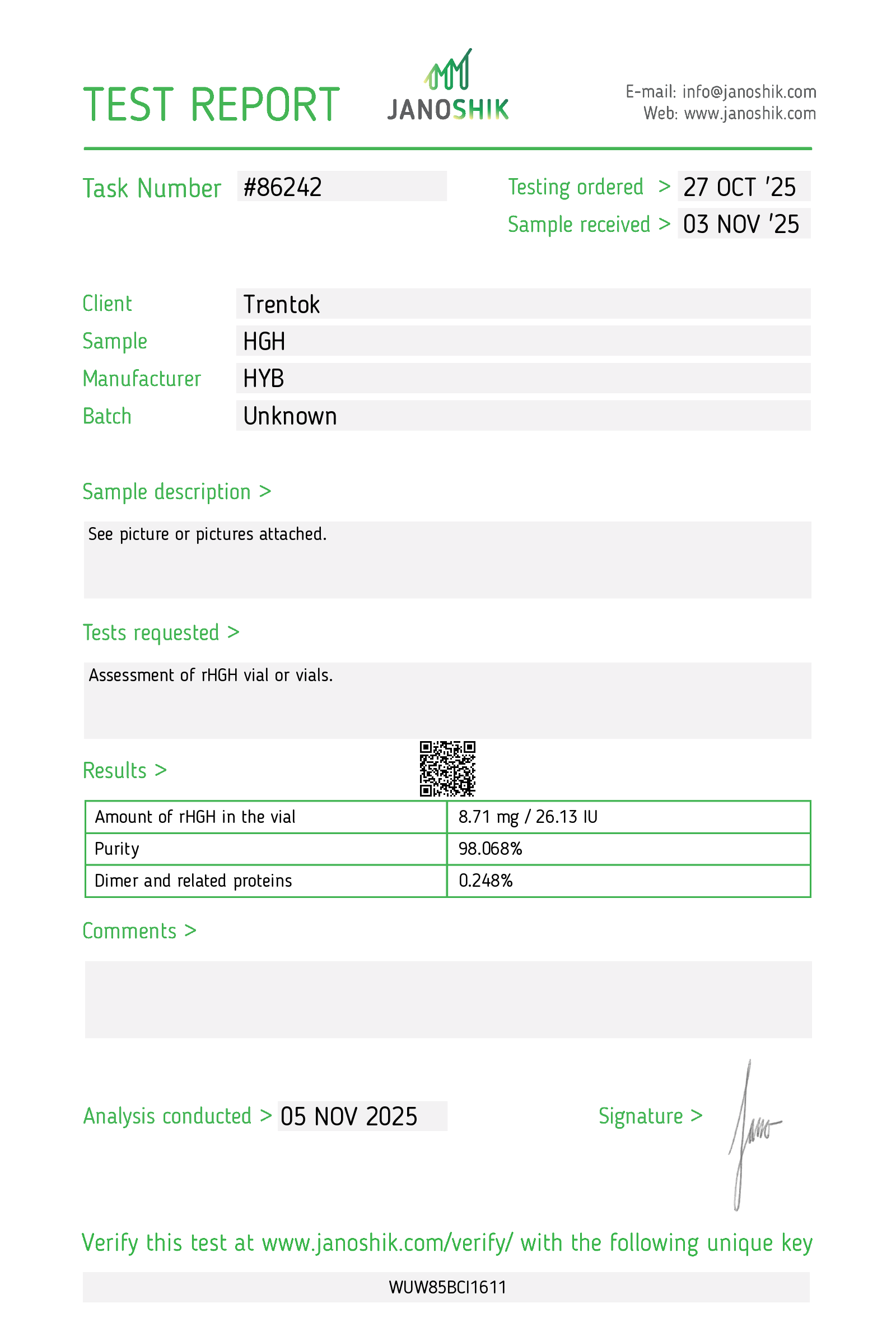 Janoshik Analytical uses fully calibrated equipment and follows strict GLP (Good Laboratory Practice) standards. The reports are impossible for us to alter, giving you 100% confidence that the results are genuine and unbiased.
